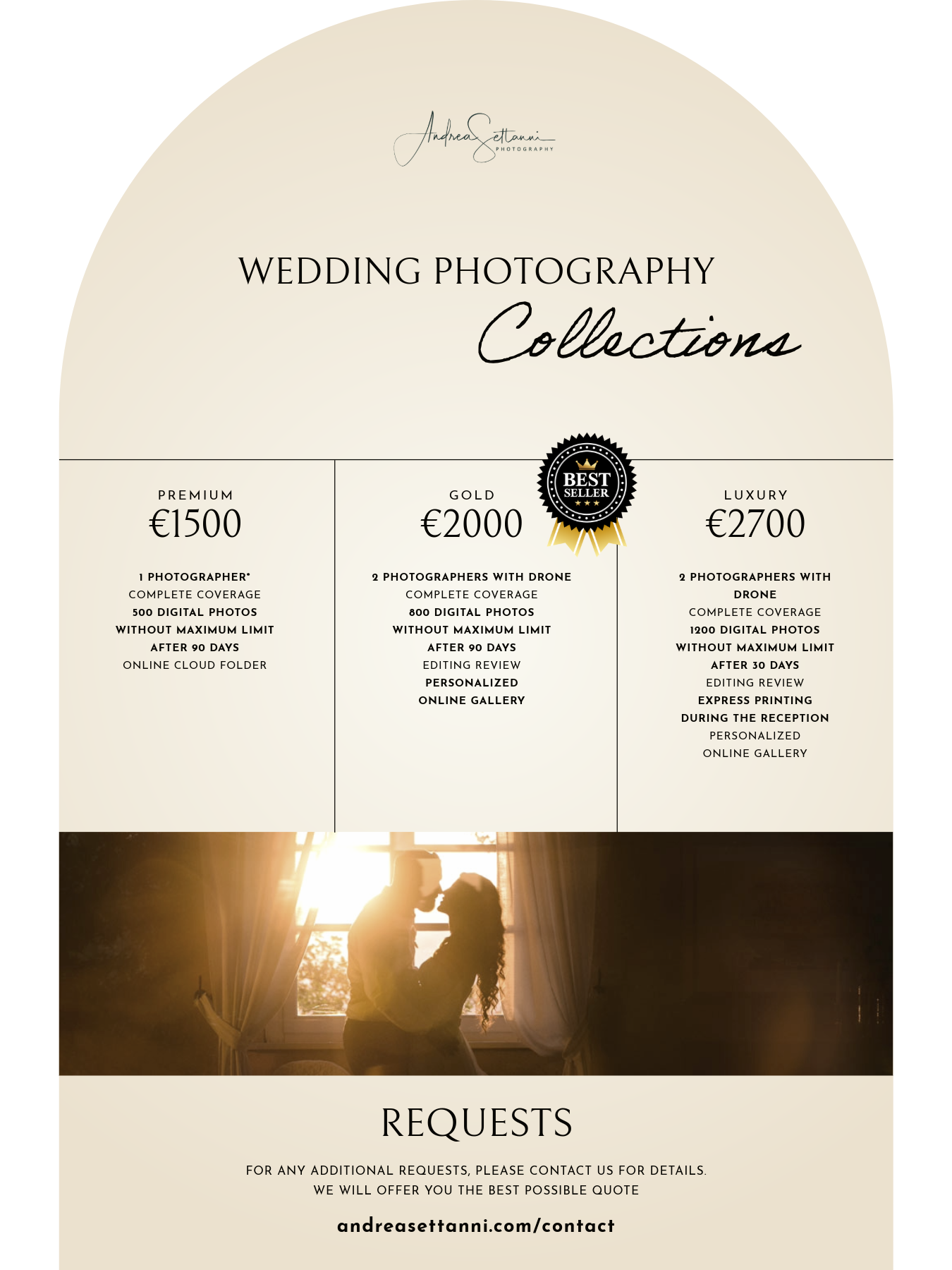 I am available for both large weddings, rich in activities and with many guests, as well as intimate weddings and elopements dedicated exclusively to the couple. Within each collection, you can choose from different options—such as the number of professional photographers—always with guaranteed full coverage and no hidden costs. That said, I love to design each service on a bespoke basis, tailoring it to your needs, your wishes, and your timeline.